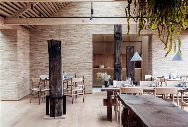 随着菜单的季节性变化,Noma的空间装饰也随之改变。设计师与Redzepi主厨一起为用餐空间设计了极具当代风格的餐桌,搭配斯堪的纳维亚风格的座椅和藤编椅被,使餐厅别有一番风味。该烟熏橡木餐桌由来自于家族企业Brdr. Krüger。餐厅里的其他家具如嵌入式和自由式服务台等均为特别定制。
